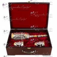 Серебро 875 пробы. С позолотой 999 пробы. Гарантия высшего качества от фирменного магазина! Изделие в деревянном футляре. Автор: Алмасов Курбан А. Член Союза Художников России. Заслуженный деятель искусств РД. Художник - ювелир. При изготовлении этого набора использовались множество процессов техники изготовления кубачинского ремесла: монтировка, гравировка, чернь, полировка. дополнительная гравировка, позолота.