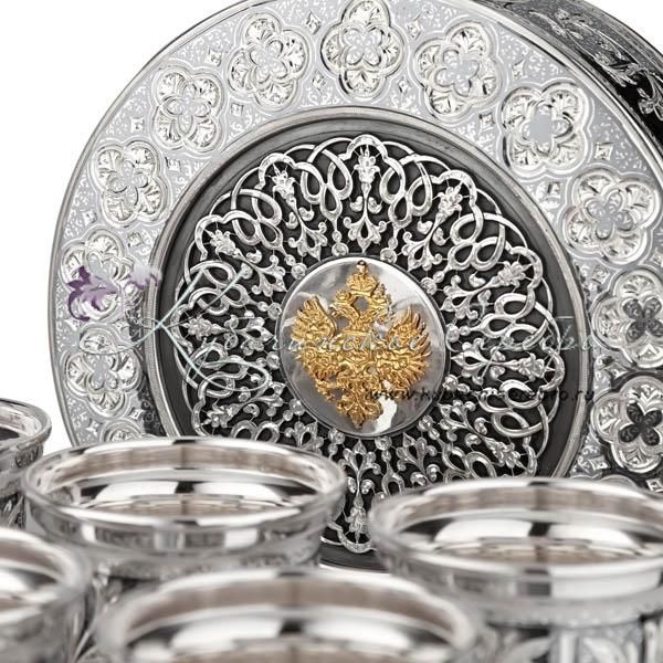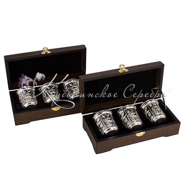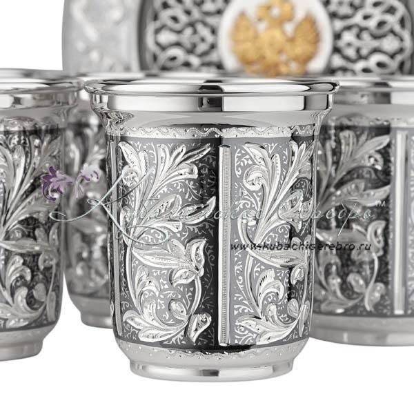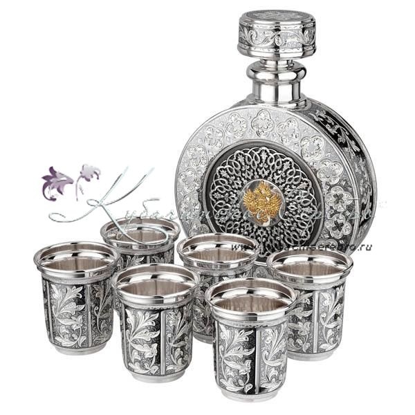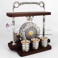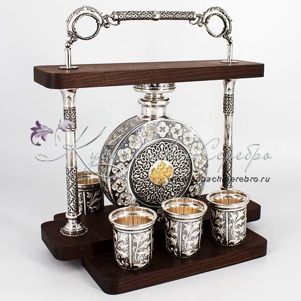 Серебро 875 пробы. В набор входят фляга и шесть стопок. Корпус выполнен из дерева с серебряным креплением. История кубачинского искусства насчитывает несколько веков! Принципы обработки серебра веками держатся в секрете и передаются от отца к сыну. Гарантия высшего качества от фирменного магазина!