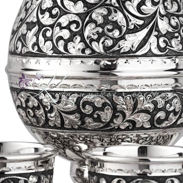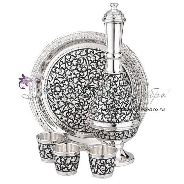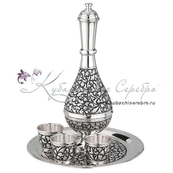 Сервиз из серебра 875 пробы, Для коньяка , водки, ликера .В сервиз входят: графин, поднос и три стопки. Великолепный серебряный сервиз от кубачинских ювелиров! Гарантия высшего качества от фирменного магазина!