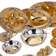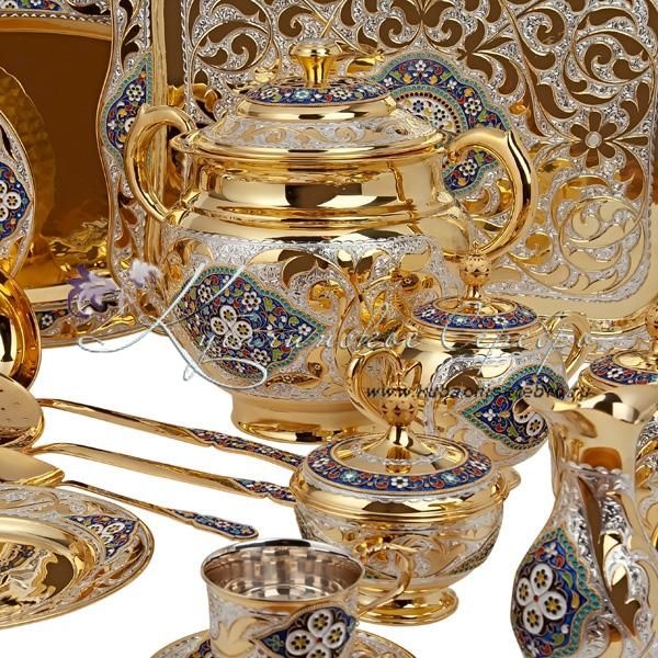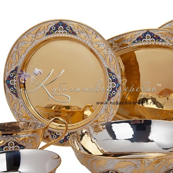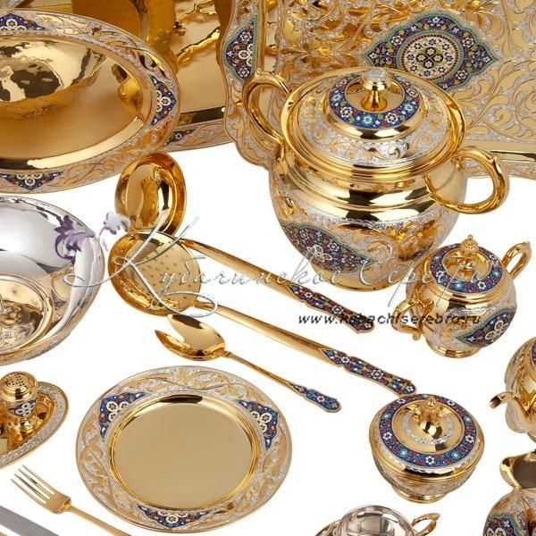 Роскошный сервиз из серебра 875 пробы, покрыт позолотой 999 пробы. Включает в себя чайный и обеденный, обеденный сервиз состоит из 47 предметов, чайный сервиз состоит из 17 предметов. В набор входят: супница с крышкой объемом 3760 мл, 6 закусочных тарелок, 6 суповых тарелок, 1 салатник, 1 круглое блюдо, 1 среднее овальное блюдо (34 см/24 см), 1 большое овальное блюдо (41 см/27,5 см) , соусник, маслёнка, набор для специй (высота солонки 6 см/диаметр 4 см; подставка 15,5/9 см) , половник, шумовка, вилка для салата, столовые приборы (6 чайных ложек, 6 столовых ложек, 6 столовых вилок, 6 ножей; длина чайной ложки 14 см, столовой ложки 18 см, вилки 18,5 см, ножа 24 см), поднос, 6 пар чашек с блюдцем, сахарница, чайник, молочник, конфетница. Столовый набор из серебра - выбор избранных ! Гарантия высшего качества от фирменного магазина!