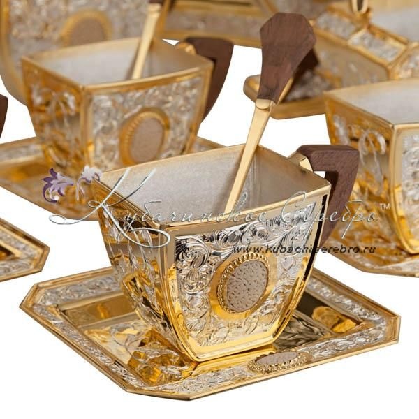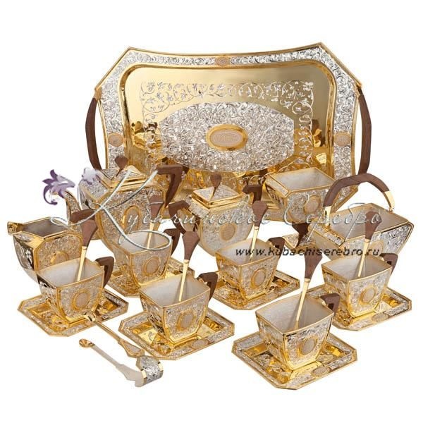 Серебро 875 пробы. Покрыт позолотой 999 пробы. Вставки- кость моржа, дерево кавказский дуб. В сервиз входят: чайник, сахарница, поднос, вареньица, конфетница, молочник, 6 пар чашек с блюдцем (длина блюдца внешней стороны 12,5 см, внутренней стороны 6,8 см), чайные ложки 6 штук, щипцы. Роскошный сервиз станет прекрасным украшением любого стола и интерьера! Авторская работа кубачинских мастеров! Гарантия высшего качества от фирменного магазина! Набор в роскошном деревянном футляре!