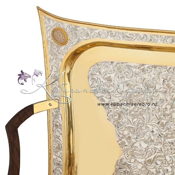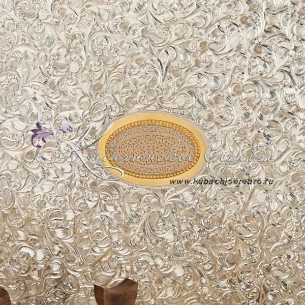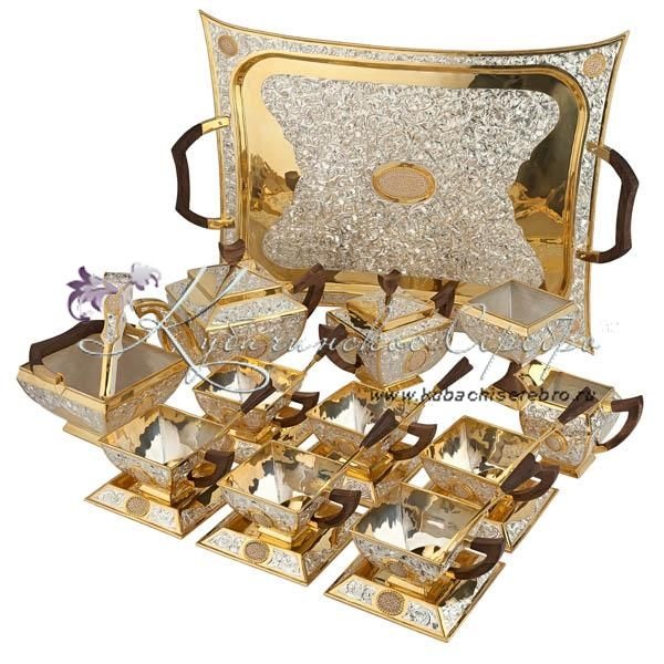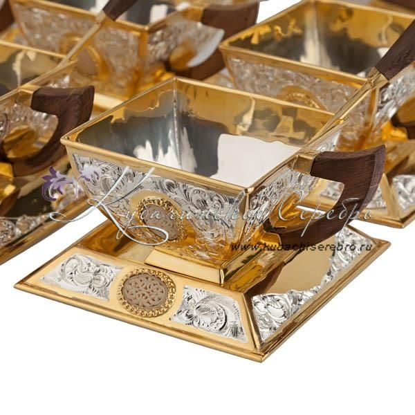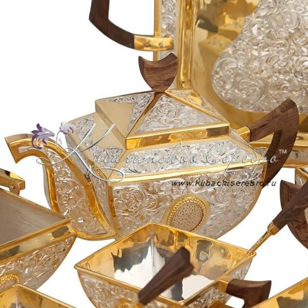 Серебро 875 пробы. Покрыт позолотой 999 пробы. Вставки- кость моржа, дерево кавказский дуб. В сервиз входят: чайник, сахарница, поднос, вареньица, конфетница, молочник (высоат 8,5 см/ толщина 7 см), 6 пар чашек с блюдцем (ширина блюдца 10,5 см) , чайные ложки 6 штук, щипцы. Роскошный сервиз станет прекрасным украшением любого стола и интерьера! Авторская работа кубачинских мастеров! Гарантия высшего качества от фирменного магазина! Набор в роскошном деревянном футляре!