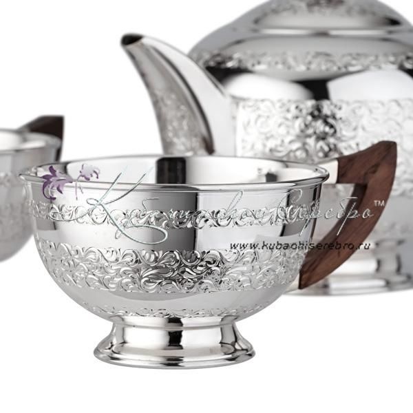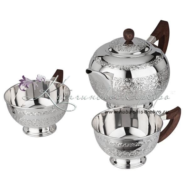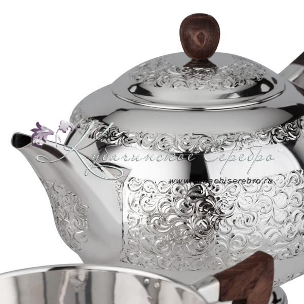 Серебро 875 пробы. В набор входят: чайник и две чашки. Вставки - дерево дуб.