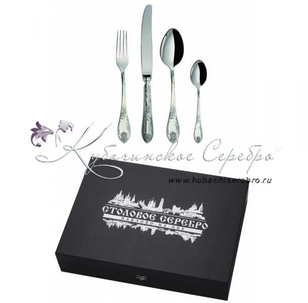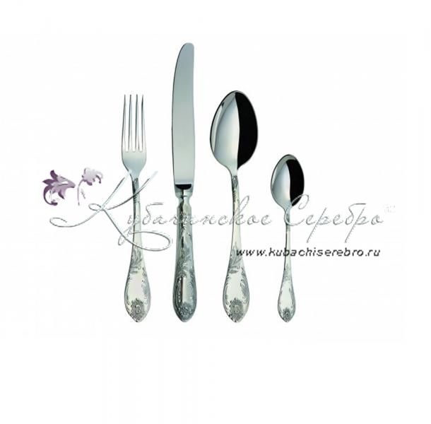 Серебро 925 пробы. ПАО "Павловский завод им.Кирова". В набор входят: ложка чайная - 6 шт., ложка столовая – 6 шт., вилка столовая – 6 шт., нож столовый – 6 шт.