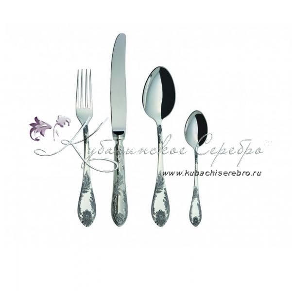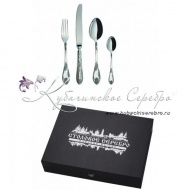 Серебро 925 пробы. ПАО "Павловский завод им.Кирова". В набор входят: ложка чайная - 6 шт., ложка столовая – 6 шт., вилка столовая – 6 шт., нож столовый – 6 шт.