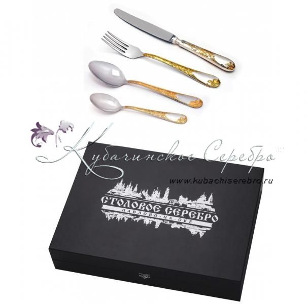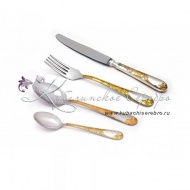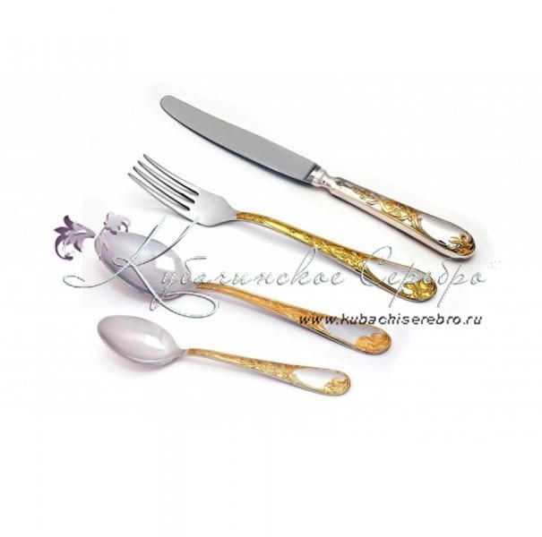 Серебро 925 пробы. Покрытие золотом 24 карата. ПАО "Павловский завод им.Кирова". В набор входят: ложка чайная - 6 шт., ложка столовая – 6 шт., вилка столовая – 6 шт., нож столовый – 6 шт.