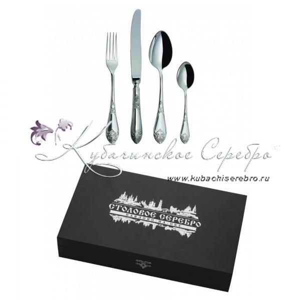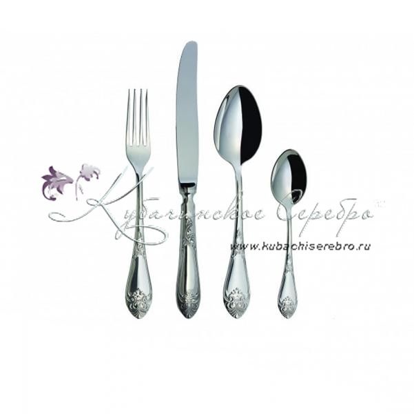 Серебро 925 пробы. ПАО "Павловский завод им.Кирова". В набор входят: ложка чайная - 1 шт., ложка столовая – 1 шт., вилка столовая – 1 шт., нож столовый – 1 шт.