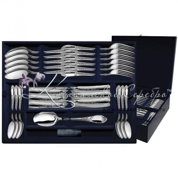 Серебро 925 пробы. Фабрика серебра "Аргента". В набор входят: ложки столовые 6 шт, ложки чайные 6 шт, вилки столовые 6 шт, ножи столовые 6 шт. Клинок ножа - нержавеющая сталь.