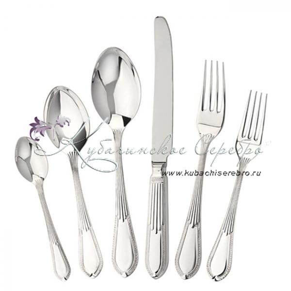 Серебро 925 пробы. В набор на одну персону входят: столовый нож 24 см, столовая ложка 20 см, столовая вилка 20,5, десертная вилка 18,5 см, десертная ложка 18,5 см, чайная ложка 13,5 см. Клинок ножа - нержавеющая сталь.