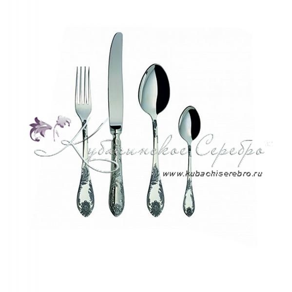 Серебро 925 пробы. ПАО "Павловский завод им.Кирова". В набор входят: ложка чайная - 1 шт., ложка столовая – 1 шт., вилка столовая – 1 шт., нож столовый – 1 шт.