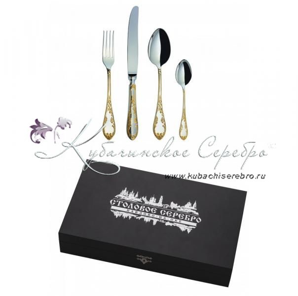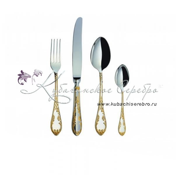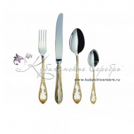 Серебро 925 пробы. Покрытие золотом 24 карата.ПАО "Павловский завод им.Кирова". В набор входят: ложка чайная - 1 шт., ложка столовая – 1 шт., вилка столовая – 1 шт., нож столовый – 1 шт.