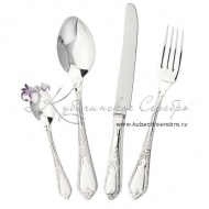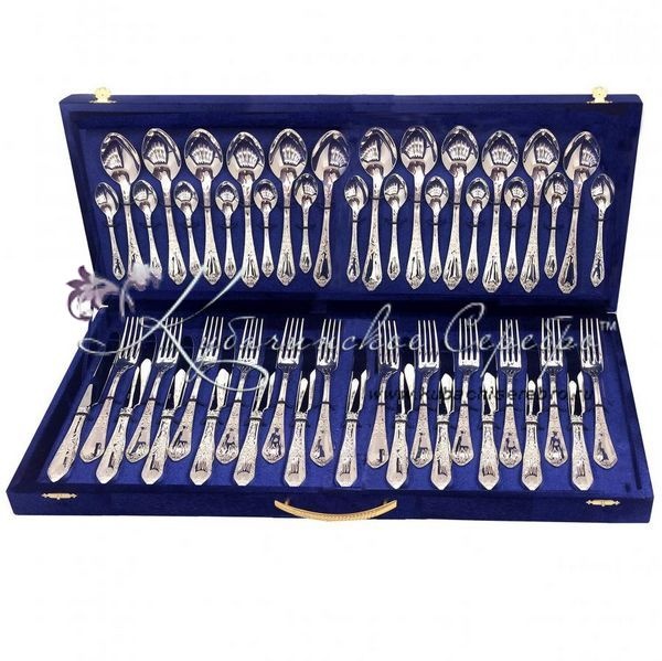 Серебро 925 пробы. В набор входят: ложки столовые 12 шт, ложки чайные 12 шт, вилки столовые 12 шт , ножи столовые 12 шт. Клинок ножа - нержавеющая сталь.