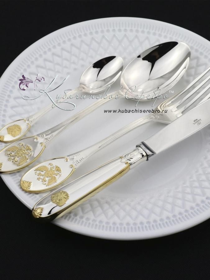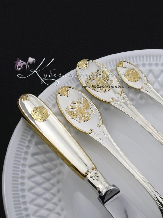 Серебро 925 пробы. Фабрика серебра "Аргента". В набор входят: ложка столовая 6 шт, ложка чайная 6 шт, вилка столовая 6 шт, нож столовый 6 шт. Клинок ножа - нержавеющая сталь. Коллекция классического столового серебра - это союз многовековых традиций и современных технологий, эстетичных форм и эргономичного дизайна. Все предметы коллекции созданы, чтобы стать заветными семейными ценностями и передаваться из поколения в поколения. Стильные и полезные, серебряные столовые приборы помогают победить негативное воздействие внешней среды и укрепляют иммунитет всей семьи день за днём.