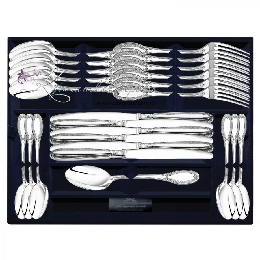 Серебро 925 пробы. Фабрика серебра "Аргента". В набор входят: ложки столовые 6 шт, ложки чайные 6 шт, вилки столовые 6 шт, ножи столовые 6 шт. Клинок ножа - нержавеющая сталь. Коллекция классического столового серебра - это союз многовековых традиций и современных технологий, эстетичных форм и эргономичного дизайна. Все предметы коллекции созданы, чтобы стать заветными семейными ценностями и передаваться из поколения в поколения. Стильные и полезные, серебряные столовые приборы помогают победить негативное воздействие внешней среды и укрепляют иммунитет всей семьи день за днём.