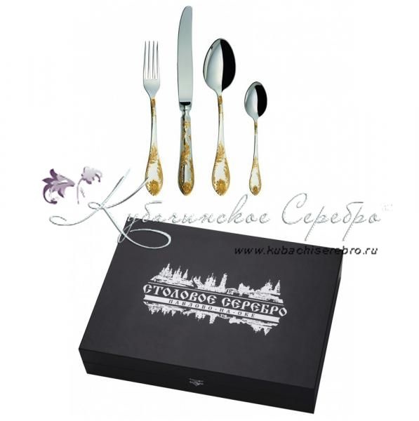 Серебро 925 пробы. Покрытие золотом 24 карата. ПАО "Павловский завод им.Кирова". В набор входят: ложка чайная - 6 шт., ложка столовая – 6 шт., вилка столовая – 6 шт., нож столовый – 6 шт.