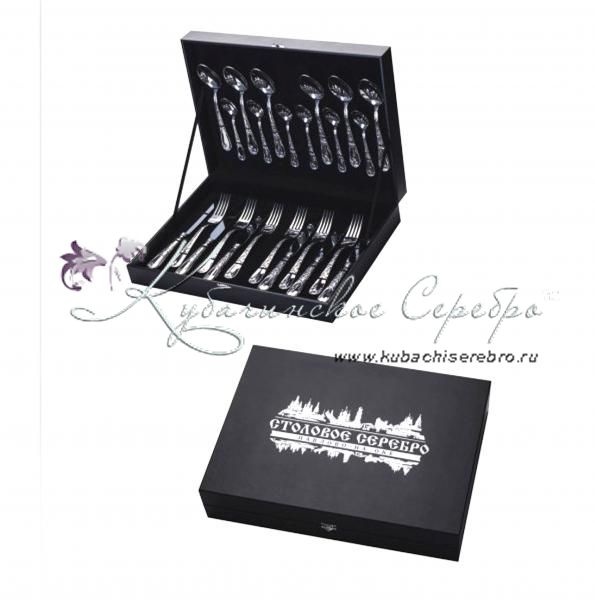 Серебро 925 пробы. ПАО "Павловский завод им.Кирова". В набор входят: ложка чайная - 6 шт., ложка столовая – 6 шт., вилка столовая – 6 шт., нож столовый – 6 шт.
