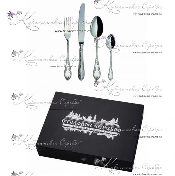 Серебро 925 пробы. ПАО "Павловский завод им.Кирова". В набор входят: ложка чайная - 6 шт., ложка столовая – 6 шт., вилка столовая – 6 шт., нож столовый – 6 шт.