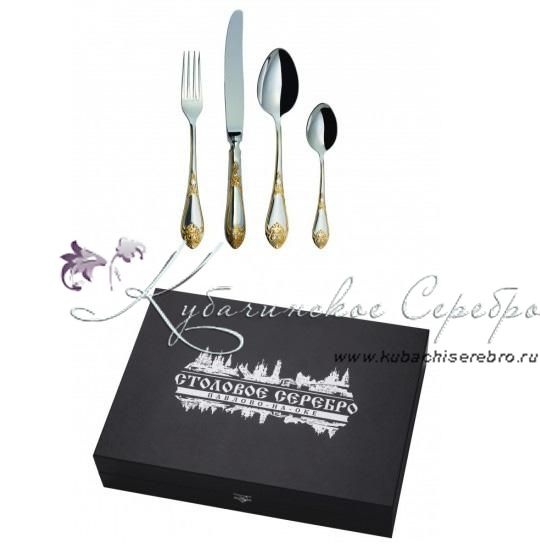 Серебро 925 пробы. Покрытие золотом 24 карата. ПАО "Павловский завод им.Кирова". В набор входят: ложка чайная - 6 шт., ложка столовая – 6 шт., вилка столовая – 6 шт., нож столовый – 6 шт.