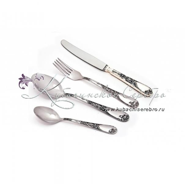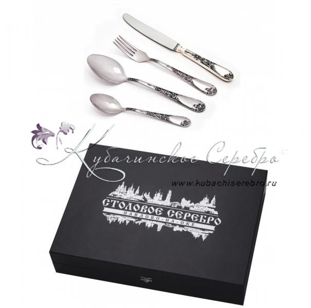 Серебро 925 пробы. ПАО "Павловский завод им.Кирова". В набор входят: ложка чайная - 6 шт., ложка столовая – 6 шт., вилка столовая – 6 шт., нож столовый – 6 шт.