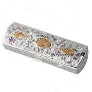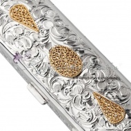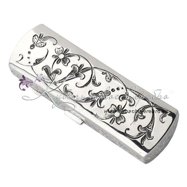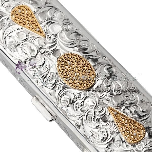 Серебро 875 пробы. С позолотой 999 пробы. Внутренняя часть покрыта материалом карпет синего цвета.