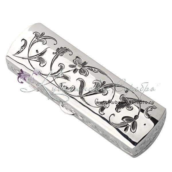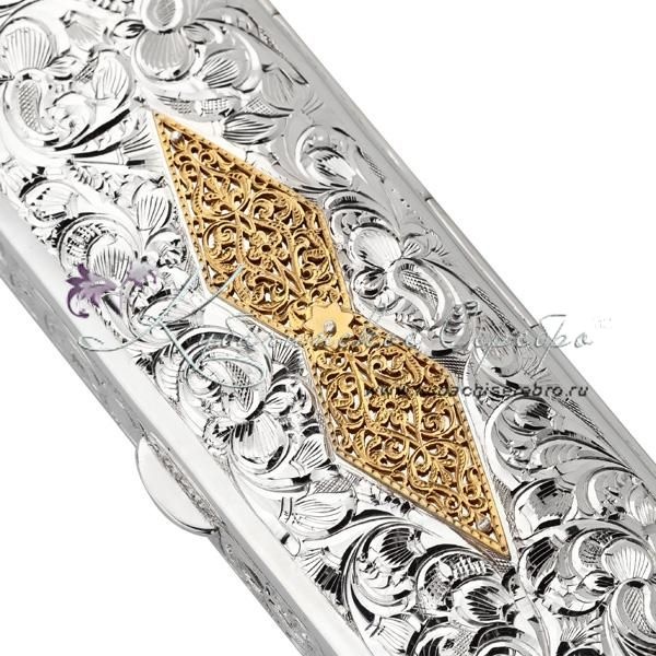 Серебро 875 пробы. С позолотой 999 пробы. Вставка - выпиленный узор. Внутренняя часть покрыта материалом карпет синего цвета.