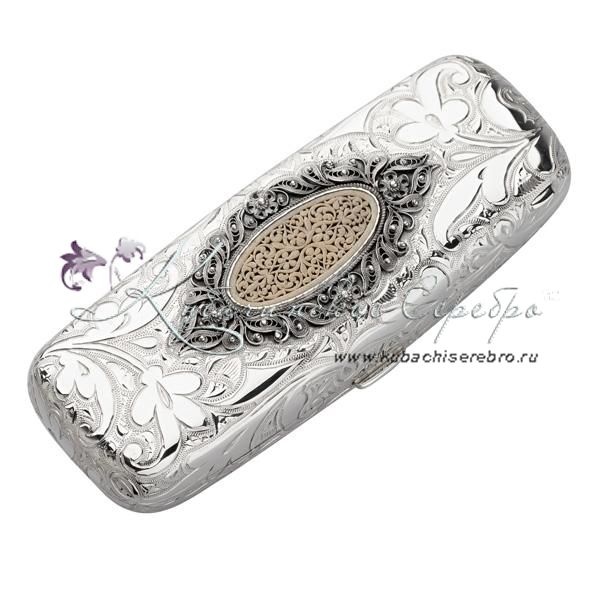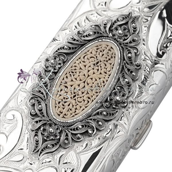 Серебро 875 пробы. Внутренняя часть покрыта флоком. Вставка - филигранная техника и восстановленная слоновая кость!