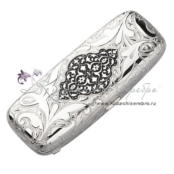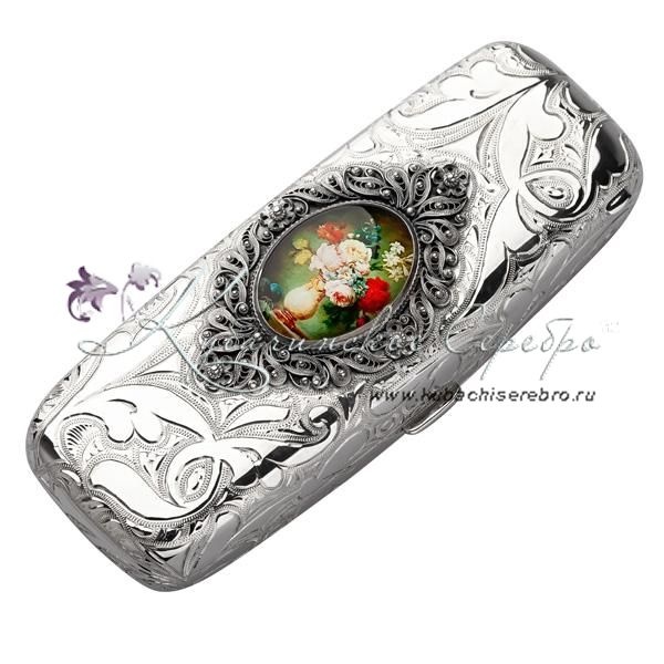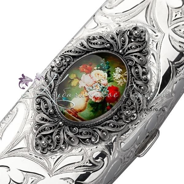 Серебро 875 пробы. Внутренняя часть покрыта флоком, филигранная техника вокруг вставки - камень кабашон. Ручная работа кубачинских ювелиров!