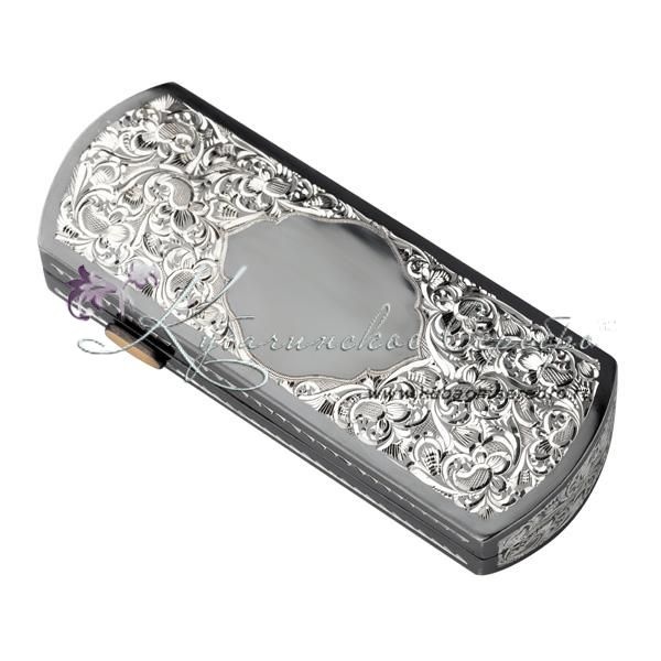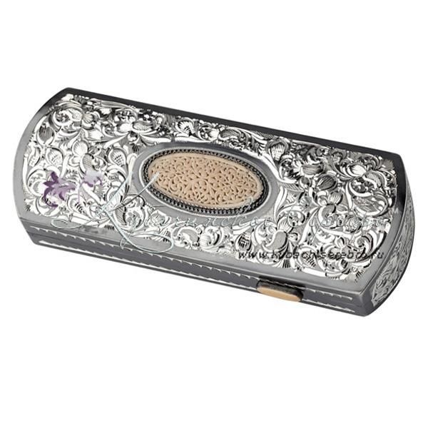 Серебро 875 пробы. Внутренняя часть покрыта флоком. Вставка - восстановленная слоновая кость. На оборотной стороне футляра имеется площадка под гравировку.