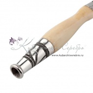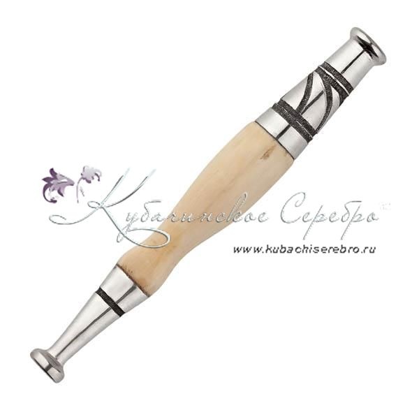 Серебро 875 пробы. Вставка - восстановленная слоновая кость. Мундштук пришел к нам из Германии, именно в этой стране создали оригинальный аксессуар, отдельную длинную трубку, в которую вставлялась сигарета. Изначально целью такого предмета было сохранить табачную массу до последней крошки и не дать пропасть даже крупинке этой пыли. Придумали мундштук в те времена, когда в ходу были сигареты-самокрутки и примитивные еще крученые сигары.