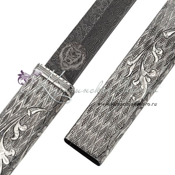 Серебро 875 пробы. На лезвии имеется изображение льва, клинок - дамасская сталь! Средний вес серебра в изделии 250 гр.