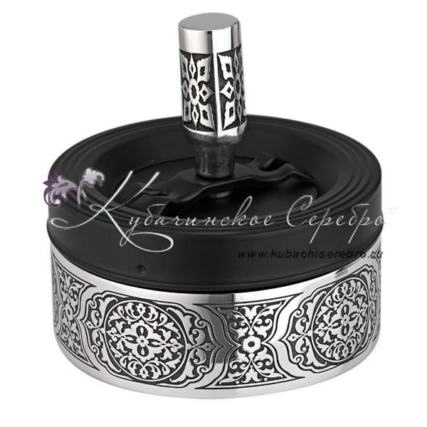 Корпус из серебра 875 пробы, механизм крышки нажимной, из стали. Крышка пепельницы имеет три углубления для сигарет и специальный поворотный механизм, при помощи которого пепел стряхивается в контейнер. Достаточно просто нажать на верх пепельницы и механизм сработает.Подарочная пепельница сувенир с нажимнымной очисткой позволит вам всегда иметь под рукой чистую и пустую пепельницу, а так же не дышать неприятным запахом от окурков и пепла. За счёт крутящегося механизма окурки и пепел бережно сбрасываются внутрь изделия, что избавляет помещение от мусора и неприятного табачного запаха.Легко чистится и моется. Плотное прилегание особой крышки гарантирует чистоту даже при опрокидывании пепельницы. Пепельница дымоуловитель будет оригинально смотреться в любом интерьере. Чтобы не портить здоровье некурящих людей, особенно детей и женщин, бездымная пепельница наилучший выход.