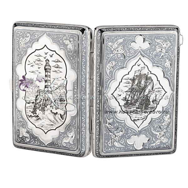 Портсигар с чернением "Корабль & Маяк" , арт №3094/1