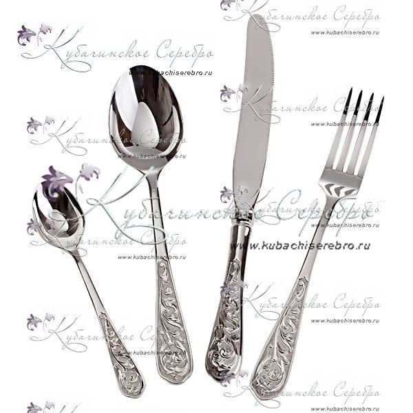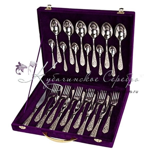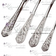 Серебро 925 пробы. В набор входят: ложки столовые 6 шт, ложки чайные 6 шт,вилки столовые 6 шт , ножи столовые 6 шт. Клинок ножа - нержавеющая сталь.