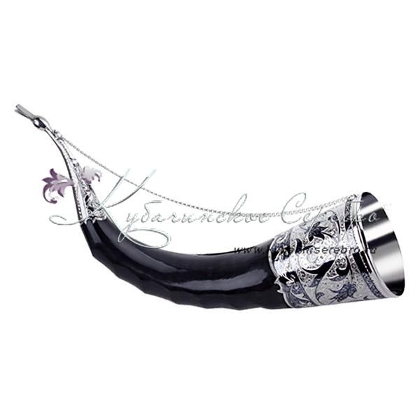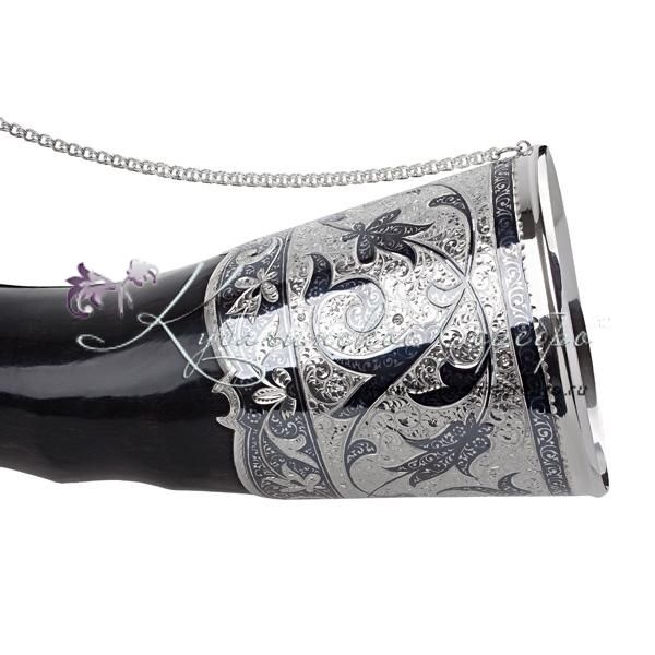 Рог быка, инкрустирован кубачинскими ювелирами - серебром 875 пробы в специальном эксклюзивном исполнении. С питьевой чашей!
