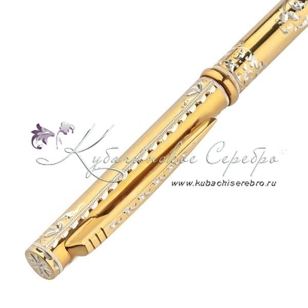 Серебро 875 пробы. Покрыта позолотой 999 пробы. Изделие в подарочном футляре. Ручка серебряная от ООО "Кубачинское серебро" – это не просто предмет для письма, а настоящее ювелирное изделие ручной работы, созданное для тех, кто ценит элегантность и качество. Эта ручка отличается исключительной прочностью и долговечностью. Паста ручки сменная, легко меняется вытягивающим движением. Гравированная вручную поверхность ручки придает уникальный шарм и стиль, делая её подходящей для любого написания. Шариковая ручка обеспечивает плавное и удобное письмо, делая каждое слово особенным. Это не только инструмент для письма, а еще красивый подарок!