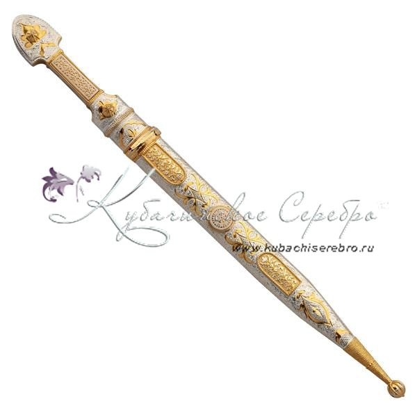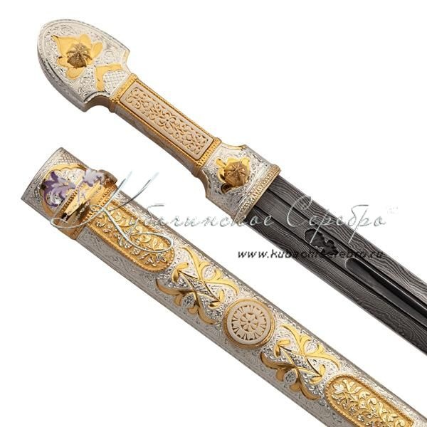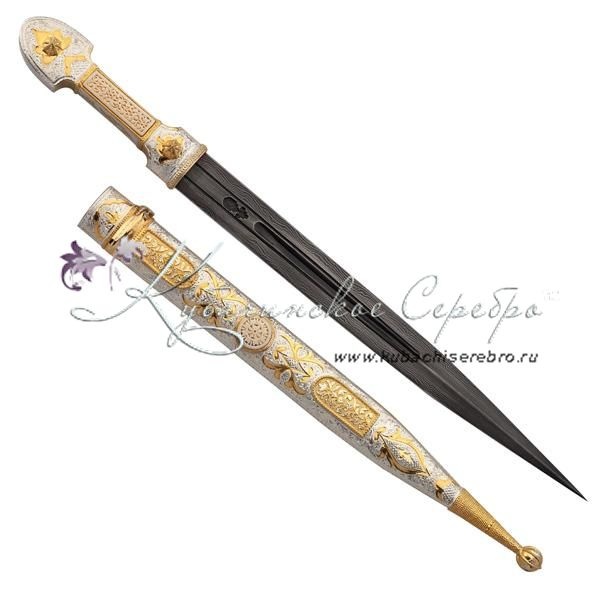 Серебро 875 пробы, покрыт позолотой 999. Клинок - дамасская сталь! Вставка - восстановленная слоновая кость. Средний вес серебра в изделии 200 гр Гарантия высшего качества от фирменного магазина!