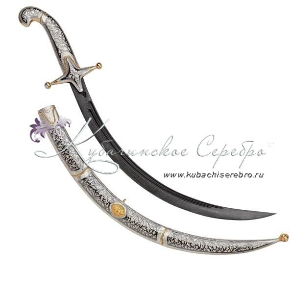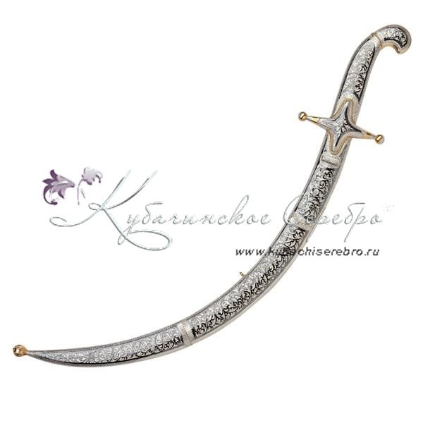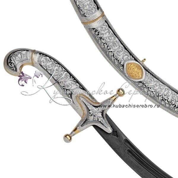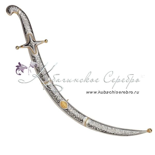 Серебряная 875 пробы, с позолотой 999 пробы. Клинок - дамасская сталь! Средний вес серебра в изделии 350 гр.