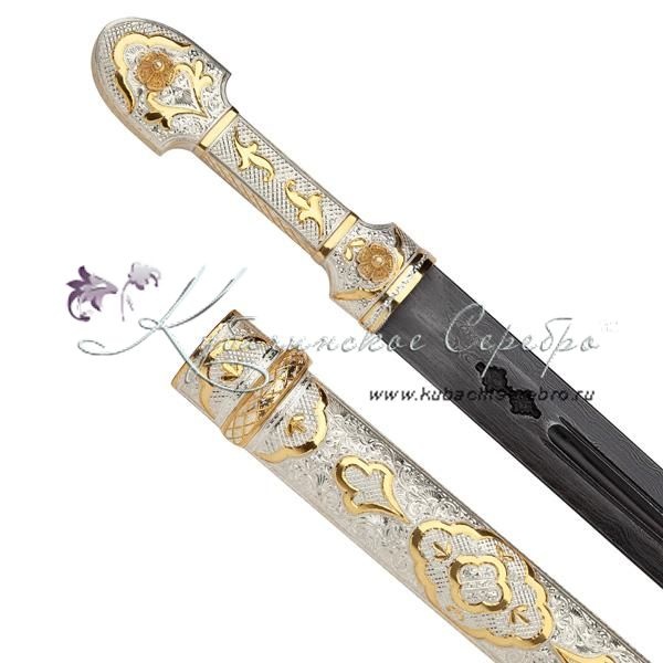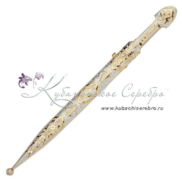 Серебряная 875 пробы, с позолотой 999 пробы. Клинок - дамасская сталь! Средний вес серебра в изделии 200 гр Гарантия высшего качества от фирменного магазина!