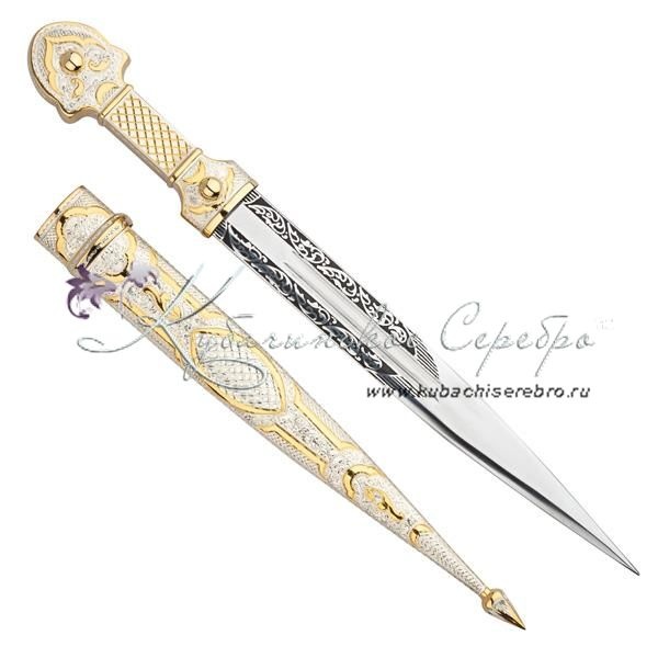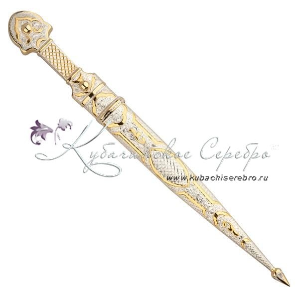 Серебро 875 пробы, покрыт позолотой 999. Клинок - кизлярская сталь! Средний вес серебра в изделии 100 гр. Гарантия высшего качества от фирменного магазина!