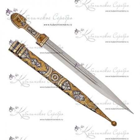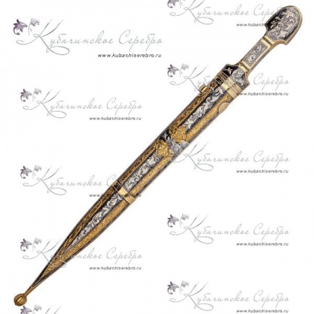 Серебро 875 пробы. Покрыт позолотой 999 пробы. Клинок - кизлярская сталь! Средний вес серебра в изделии 300 гр.