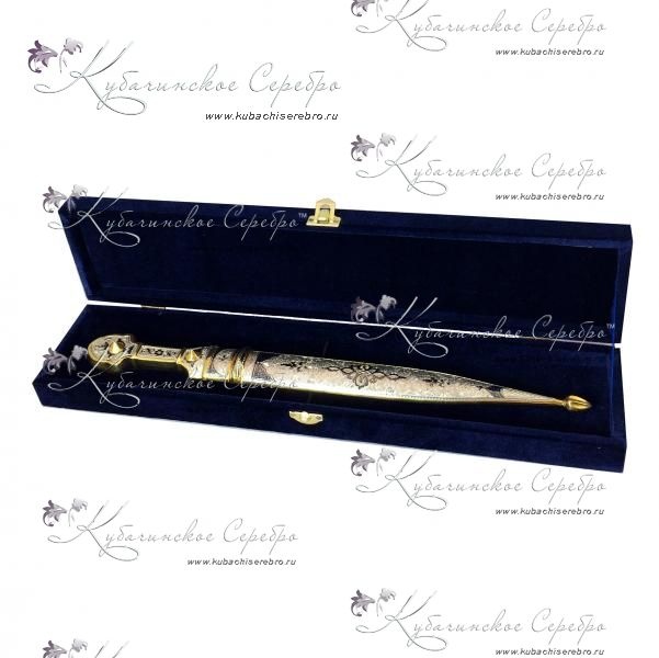 Серебро 875 пробы. Средний вес серебра в изделии 150 гр. Покрыт позолотой 999 пробы. Клинок - кизлярская сталь.