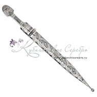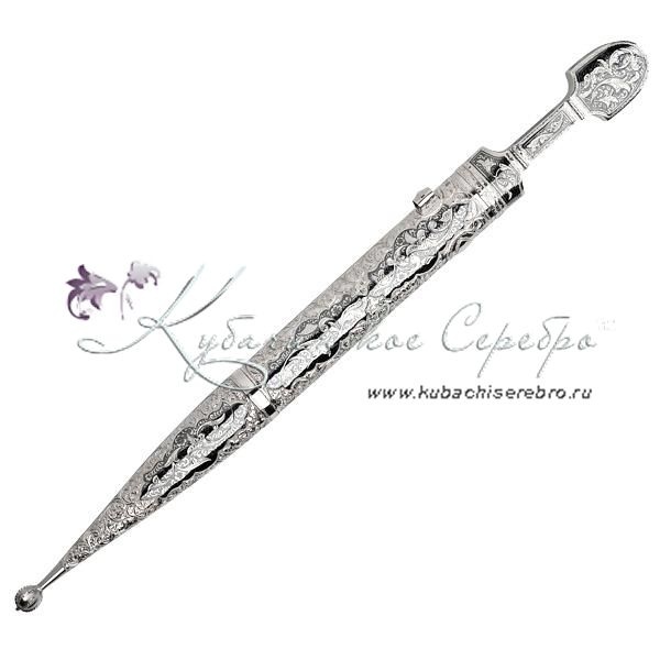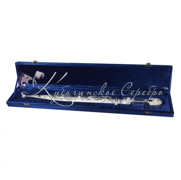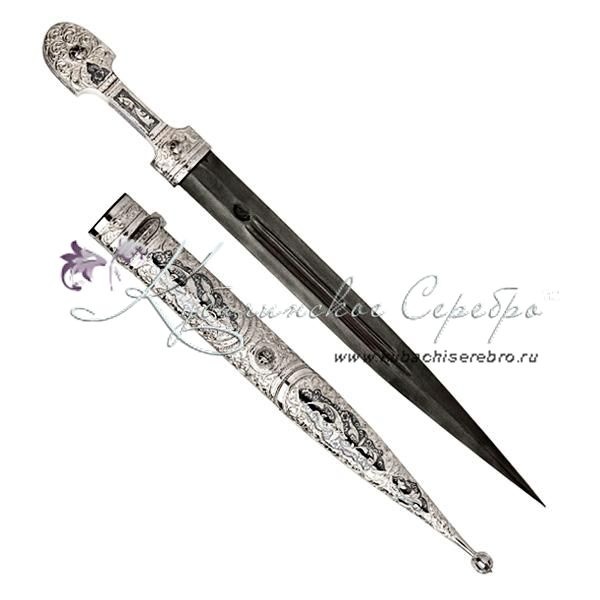Серебро 875 пробы. В премиумном исполнении от кубачинских мастеров. Средний вес серебра в изделии 300 гр. Клинок - дамасская сталь. Гарантия высшего качества от фирменного магазина!