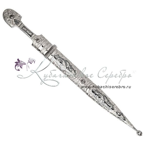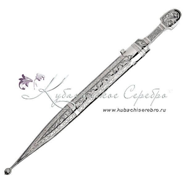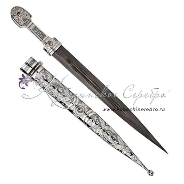 Серебро 875 пробы. Средний вес серебра в изделии 250 гр. В премиумном исполнении от кубачинских мастеров. Клинок - дамасская сталь. Гарантия высшего качества от фирменного магазина!