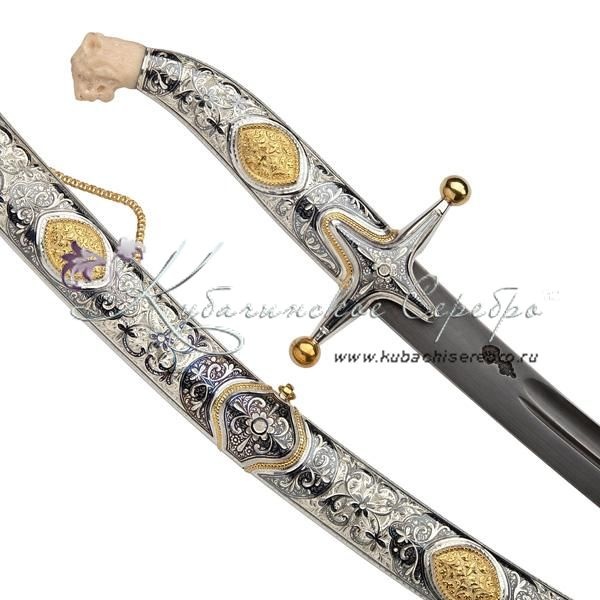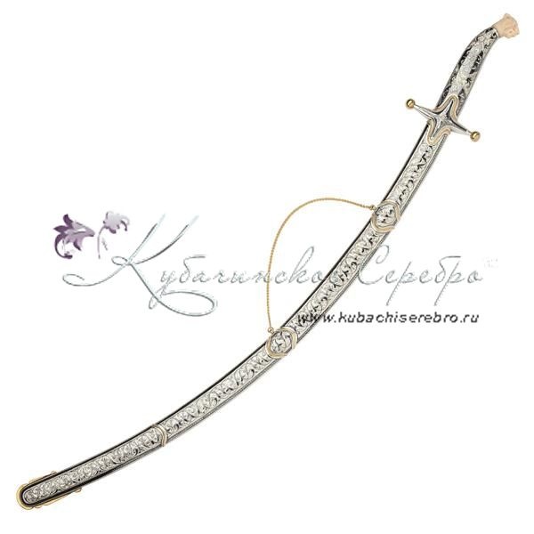 Серебряная 875 пробы. Покрыта позолотой 999 пробы. Боевая сабля, клинок - каленная сталь. Средний вес серебра в изделии 350 гр. Гарантия высшего качества от фирменного магазина!