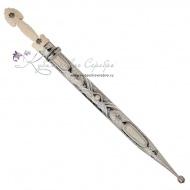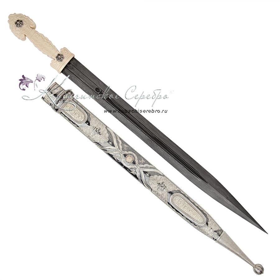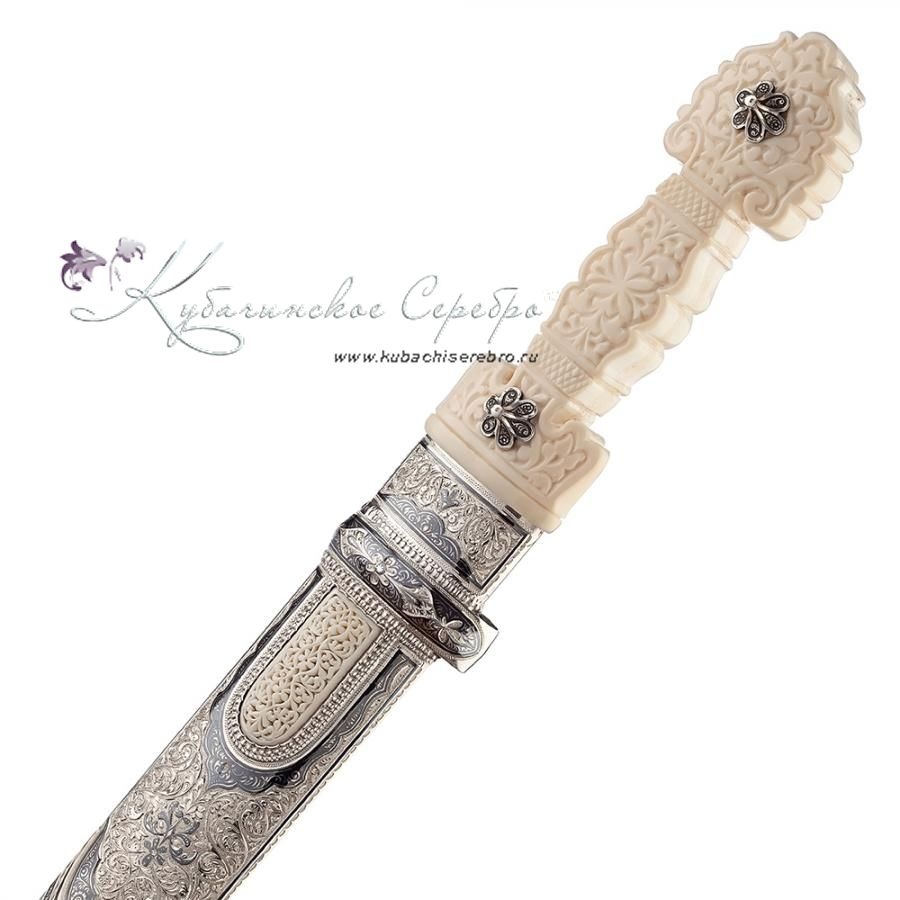 Серебро 875 пробы. Клинок - дамасская сталь! Вставка - восстановленная слоновая кость. Средний вес серебра в изделии 400 гр. Гарантия высшего качества от фирменного магазина!