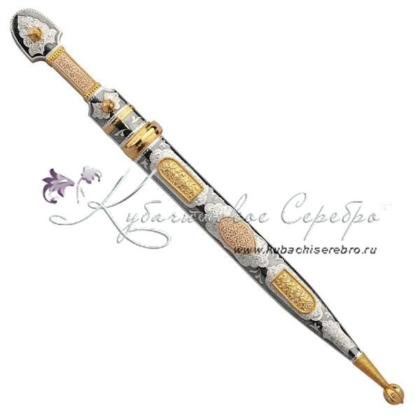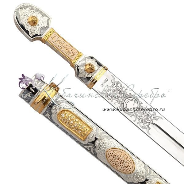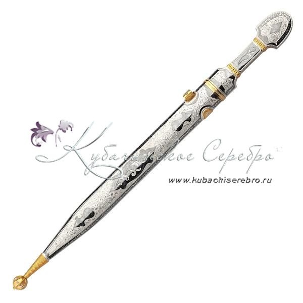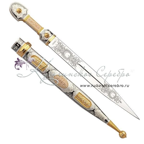 Серебро 875 пробы. С позолотой 999 пробы. Клинок - кизлярская сталь! Вставка - восстановленная слоновая кость. Средний вес серебра в изделии 200 гр. Гарантия высшего качества от фирменного магазина!
