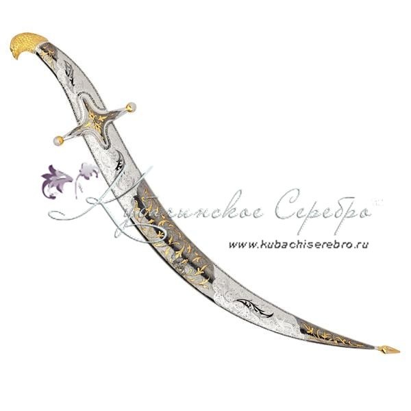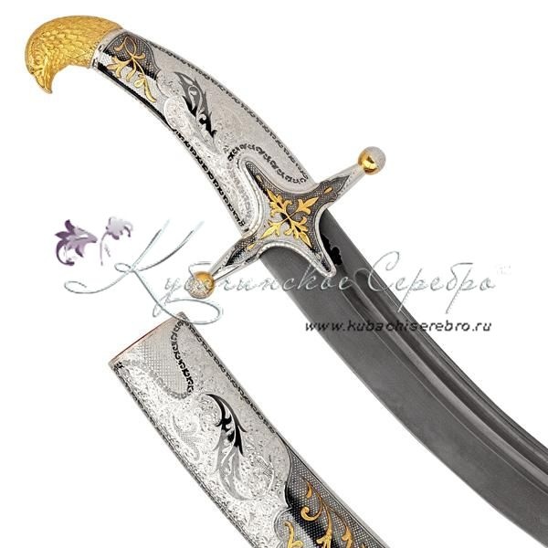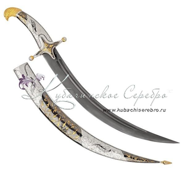 Серебряная 875 пробы, с позолотой 999 пробы. Рисунок - фантазия ювелира, традиционно в кубачинском стиле, но постоянно новый. Клинок - калёная сталь! Средний вес серебра в изделии 200 гр.