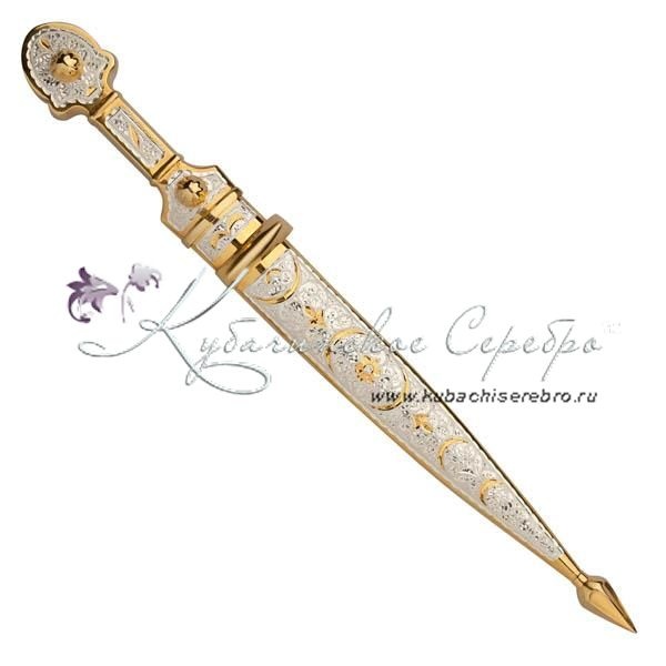 Серебряный 875 пробы, с позолотой 999 пробы. Клинок - кизлярская сталь. Средний вес серебра в изделии 80 гр. Гарантия высшего качества от фирменного магазина!