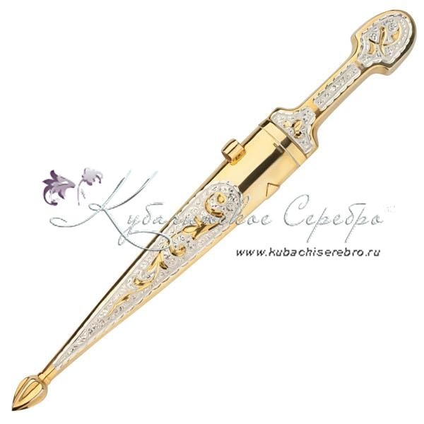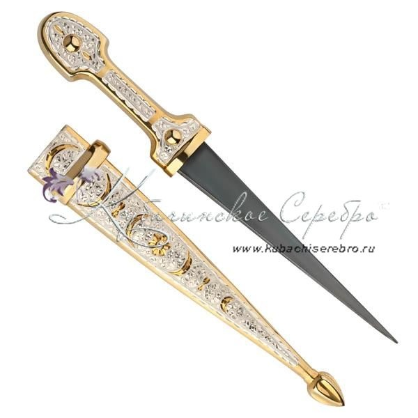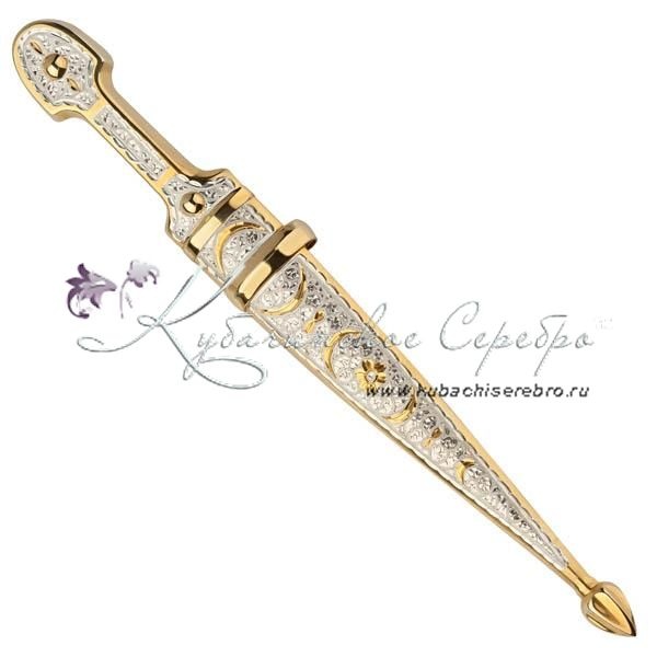 Серебряный 875 пробы, с позолотой 999 пробы. Клинок - кизлярская сталь с воронением (иначе оксидированием) называют процесс покрытия поверхности изделий из стали тонким слоем оксидов. Воронение проводят химическим способом- с помощью реакций с различными веществами и термическим — путем нагревания. Средний вес серебра в изделии 50 гр. Гарантия высшего качества от фирменного магазина!