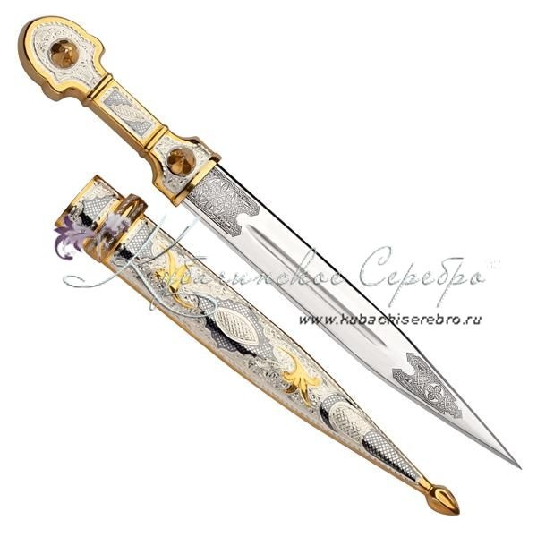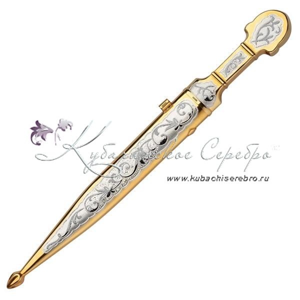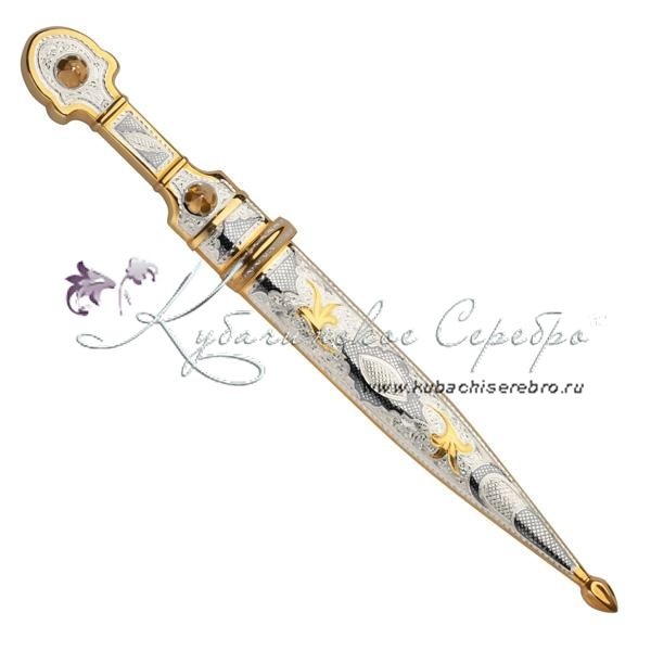 Серебряный 875 пробы, с позолотой 999 пробы. Клинок - кизлярская сталь. Средний вес серебра в изделии 100 гр. Гарантия высшего качества от фирменного магазина!